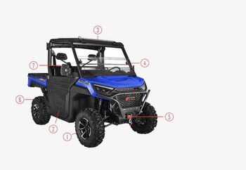 | • 649cc V-Twin Engine • Half Doors (included) • Roof with Light Bar(included) • Tempered glass front windshield (included) • 3500lb Winch (included) • Front Bumper (included) • LED lighting and Turn signals (included) • Under seat storage box (included) • Receiver hitch (included) • Mirrors (included) • 3 year manufacturer warranty (included) |