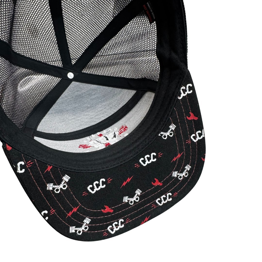 Crafted with a durable black front panel and breathable mesh backing, it keeps you cool in the garage. The curved bill features rugged contrast stitching, while the embroidered CCC logo up front showcases crossed wrenches and bold red accents—because your gear should look as tough as your bike.
